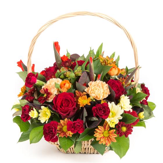 A rich mix of deep autumnal reds, rusts and golds. Including roses, spray carnations, alstromeria and chrysanthemums.