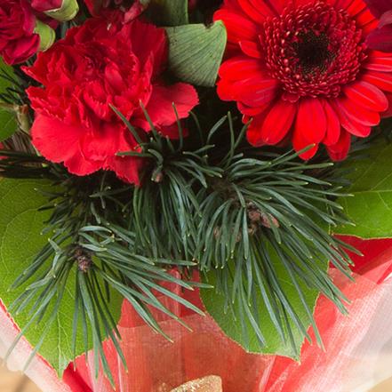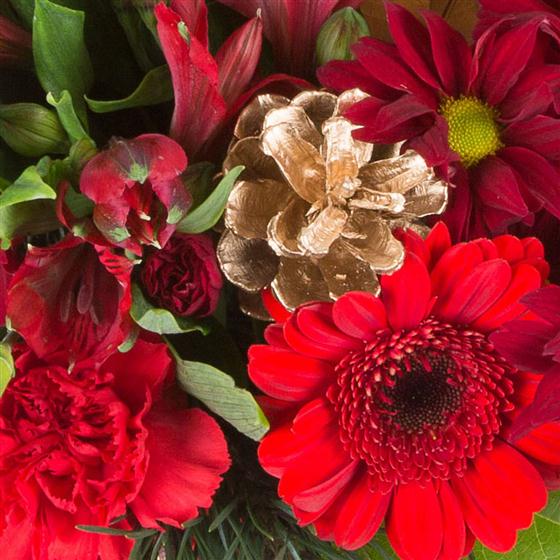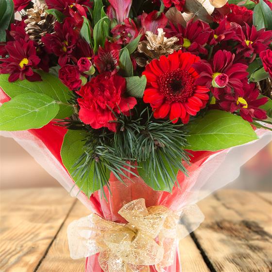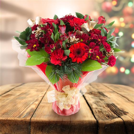 A popular Christmas bouquet with seasonal flowers amidst seasonal foliage’s with pine cones. This bouquet not only looks Christmassy but smells Christmassy too!