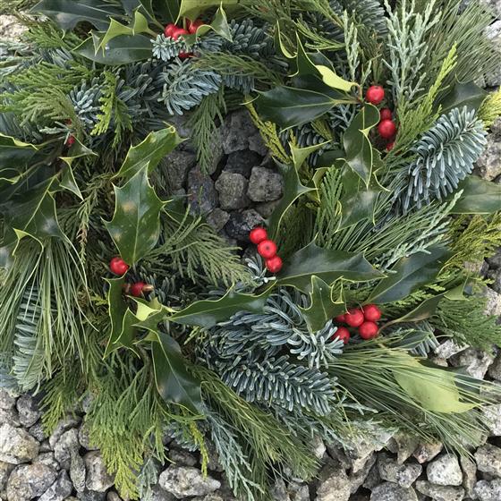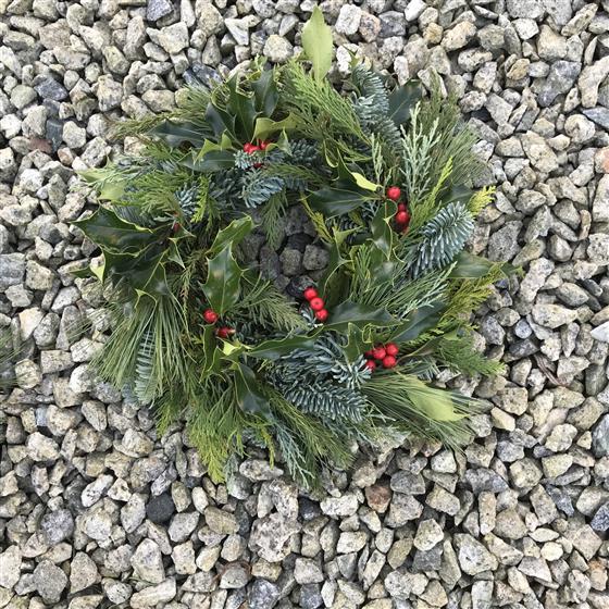 Hand made, mossed based 10" Christmas mixed seasonal foliage with holly - can’t guarantee the holly berries