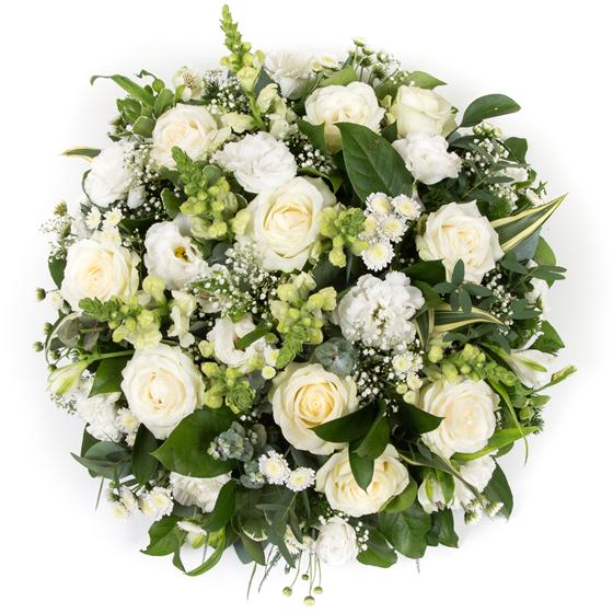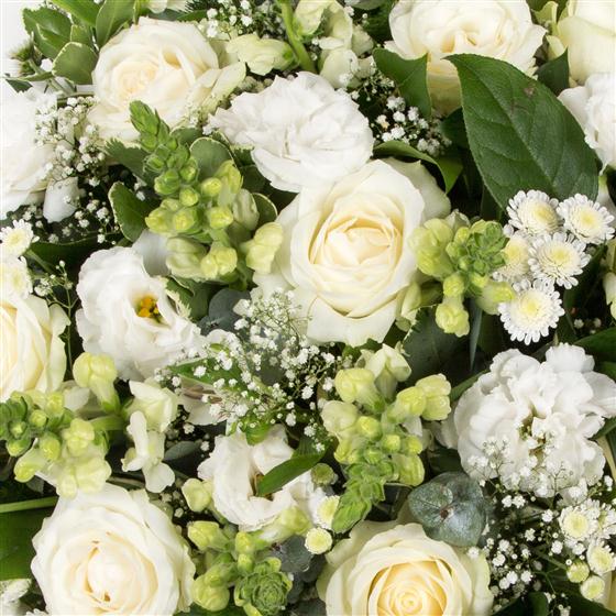 A collection of classical white and cream flowers roses, amidst gypsophila florets and various green foliages to create a simple and beautiful tribute.