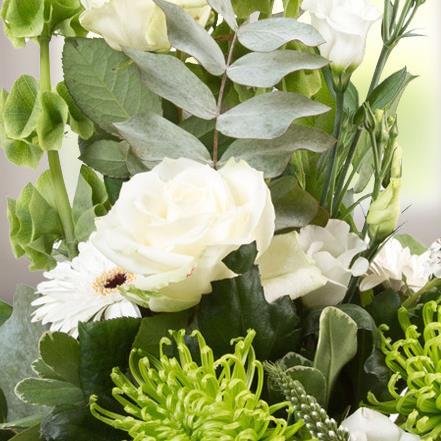 A stunning, simple and contemporary cube arrangement in whites and limes, including molucella, shamrock blooms and roses.