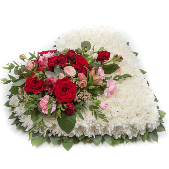 A massed heart shaped tribute with a deep red and baby pink spray, including roses, alstromeria and spray carnations. Available with a foliage or ribbon surround and a variety of colours.