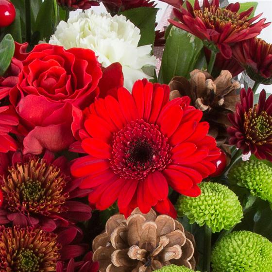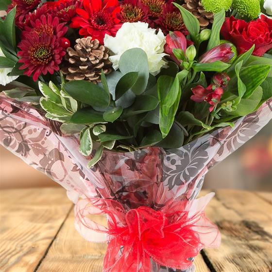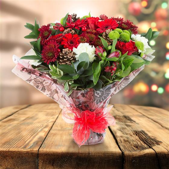 A very traditional festive Christmas seasonal hand-tied aqua bouquet of whites, green and reds.