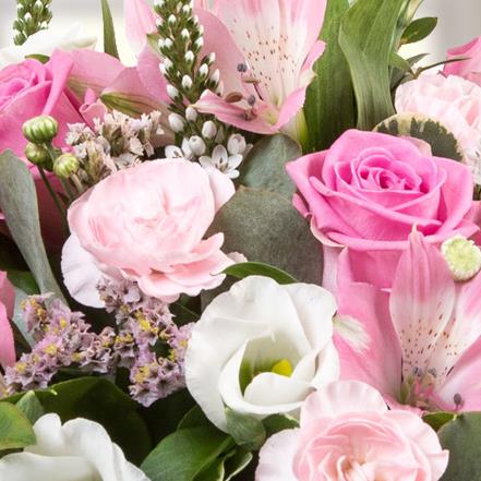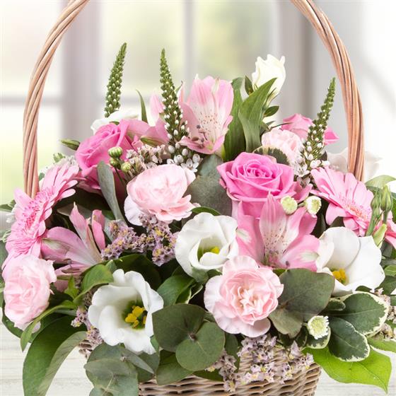 A dainty all round basket arrangement in light pink and cream tones as pictured or in your choice of colours.