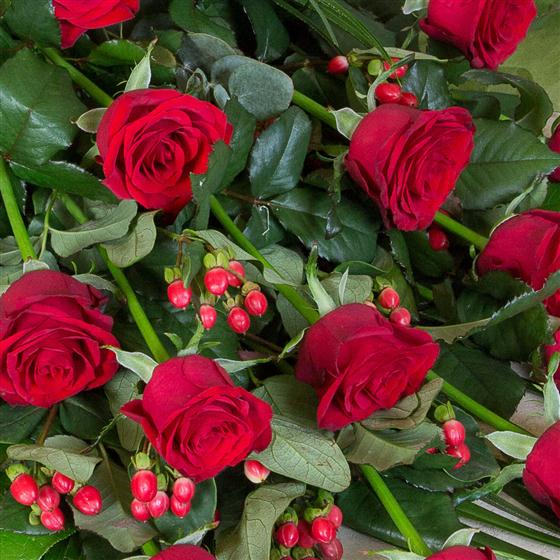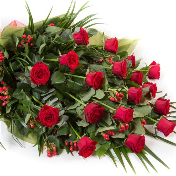 Long stemmed red roses amidst mixed seasonal foliage’s combined to make an elegant, simple tribute. Roses are available as pictured or in white, pink or yellow.