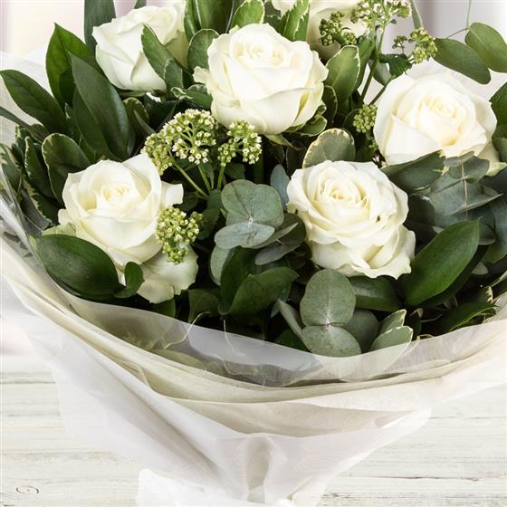 Six long stemmed white roses mingled with mixed foliage presented in water.