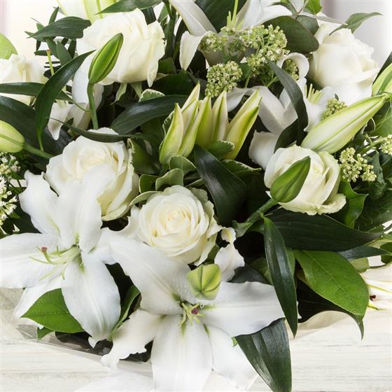 A fragrant hand-tied bouquet of oriental lilies and white roses mixed with eucalyptus and seasonal foliage’s.